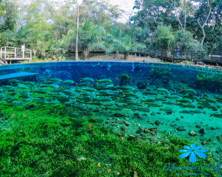O passeio da Nascente Azul inicia-se por uma trilha suspensa de 800 metros rica fauna e flora, onde poderão ser observados macacos, antas, e muitas aves. A paisagem é deslumbrante, uma linda vista da Serra da Bodoquena. Ao final da trilha chega-se a Nascente Azul, um imenso espelho d’água que permitirá ao visitante desfrutar de momentos incríveis, nadando junto a variadas espécies de peixes. A flutuação é realizada na nascente do Rio Bonito, em torno de 400 metros, que por sua coloração turquesa leva o nome de Nascente Azul e dura em torno de 40 minutos. Ao fim do passeio de flutuação é possível tirar o resto do dia na Praia da Capela e aproveitar o novo circuito de aventura do atrativo, o Aqualokko com a mais alta tirolesa da cidade.